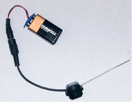 Using the battery adapters, power both the camera and the receiver unit with new high-quality 9 volt batteries. A single 9 volt battery should power the receiver unit for approximately 8 hours. The camera may become warm, as it has no internal fan. This is normal. The battery and battery adapter can be replaced with a 12 volt wall adapter. A wall adapter should have an amperage of no more than 250mA.